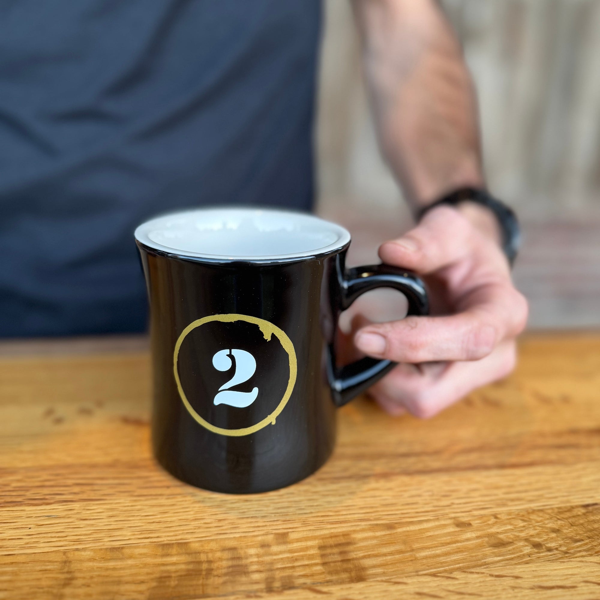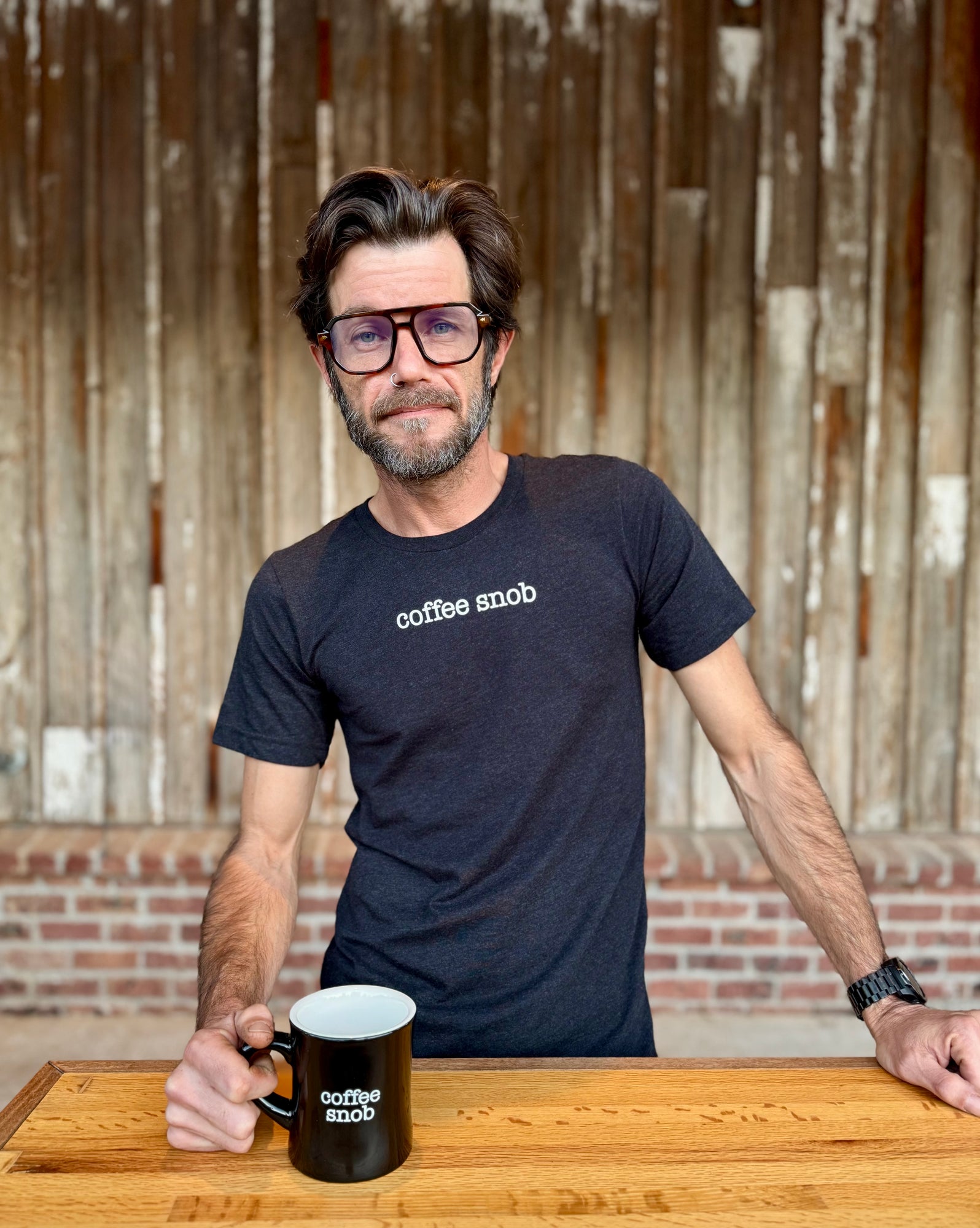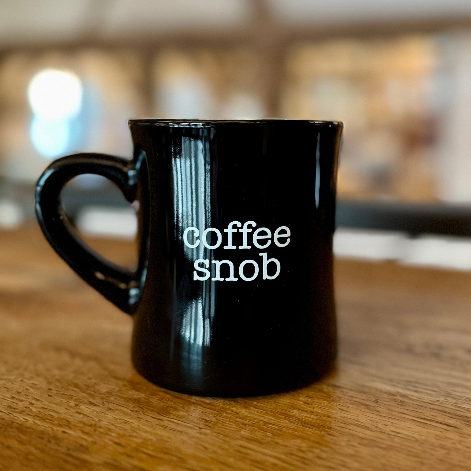This is the same heavy duty diner mug we use in-house for drip coffee. At DoubleShot we have a different cup for every drink, so it's easy to look across the room and see what people are drinking. The black mugs are for black coffee drinkers, white for those who pollute it with milk. This one is black. The coffee snob shirt has been so popular that I decided to order mugs. If your friends refer to you as a snob, perhaps it's time to embrace it. You're in good company.