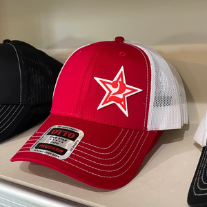 It's a red and white Otto snapback trucker hat with a molded pvc patch on your left.