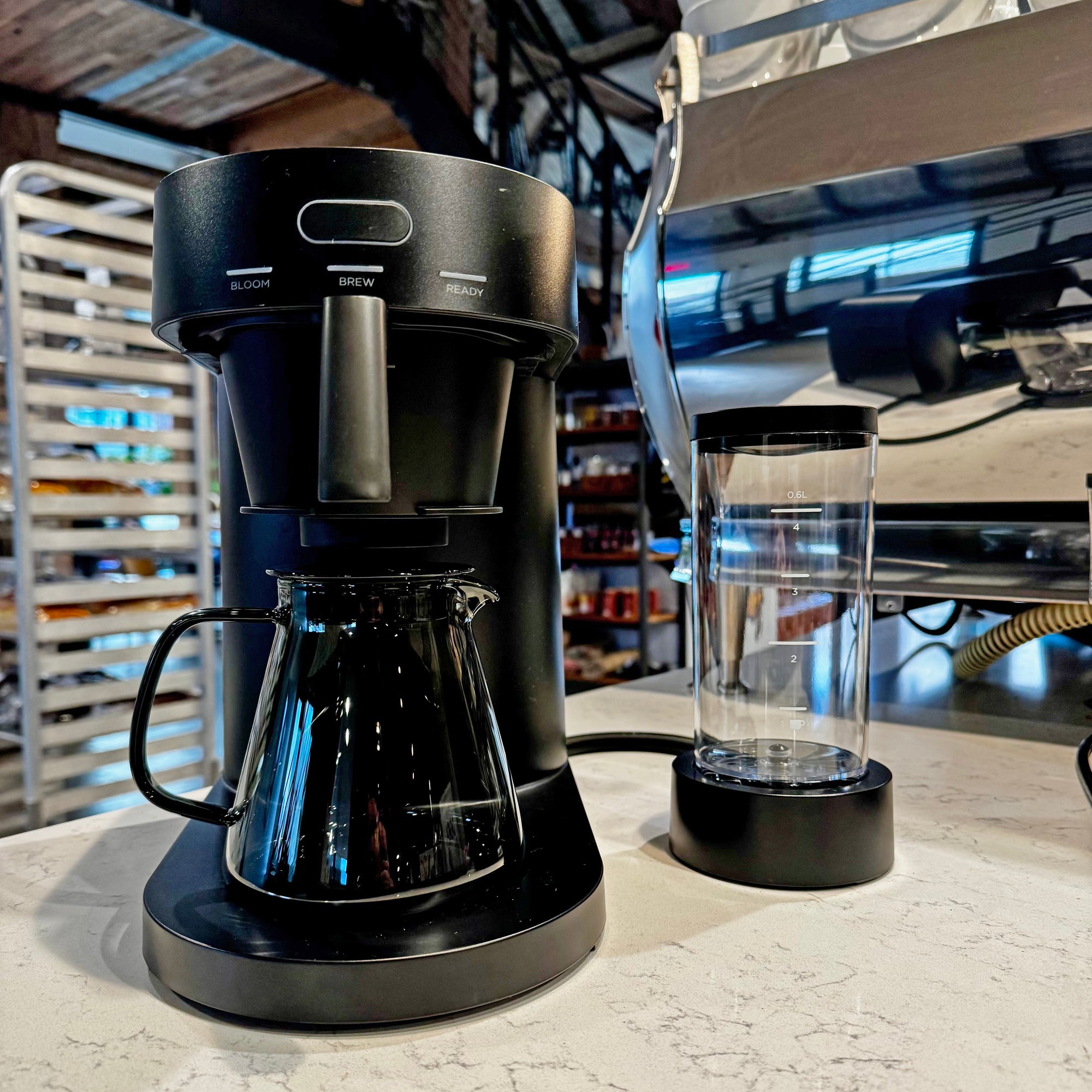 Another thing I wasn't sure about is the external water reservoir. But this is brilliant. I like brewing by the gram, not eyeballing a measurement line on the boiler. So the Four allows me to put the detachable tank on a scale and pour exactly the amount of water in for the ratio of coffee I'm using. Because I'm not brewing a "four cup" batch. I'm usually grinding 32.5 grams of coffee and I want 390 grams of water, sometimes 422 grams, depending how I'm feeling.